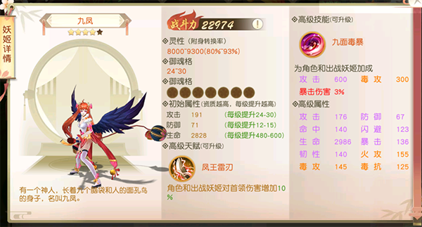 九面毒暴是九凤的专属高级技能,可为角色和出战的妖姬提高攻击、毒攻、和暴击伤害百分比的属性加成。